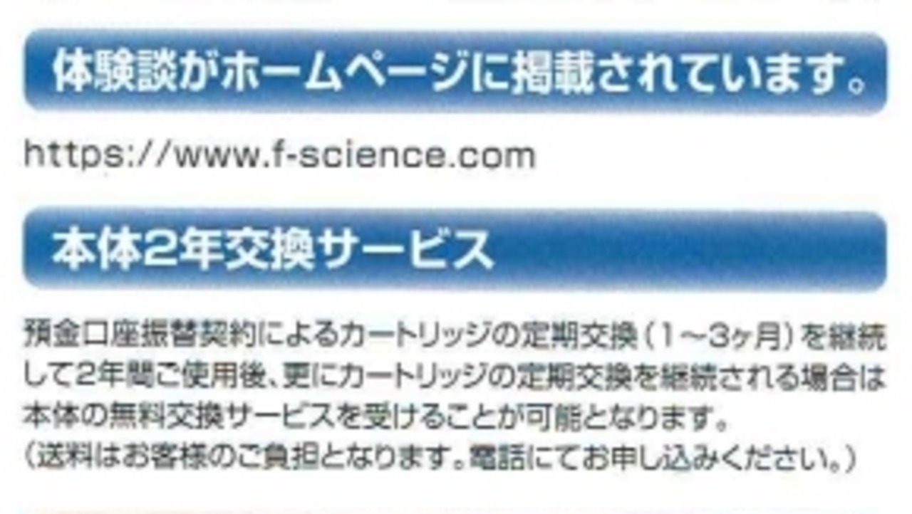 お願いになりますが、この浄水器を効果的かつ確実に有害物質を取り去る機能性を維持させるためにはカートリッジの定期交換が必要となります。これに伴いまして大変お手数ではございますが、「預金口座振替申込書」に必要事項をご記入いただきましてご捺印のうえ、4枚目の「お客様控え」を保管していただき、残りの3枚を弊社にあてご返送いただけますようお願い申し上げます。